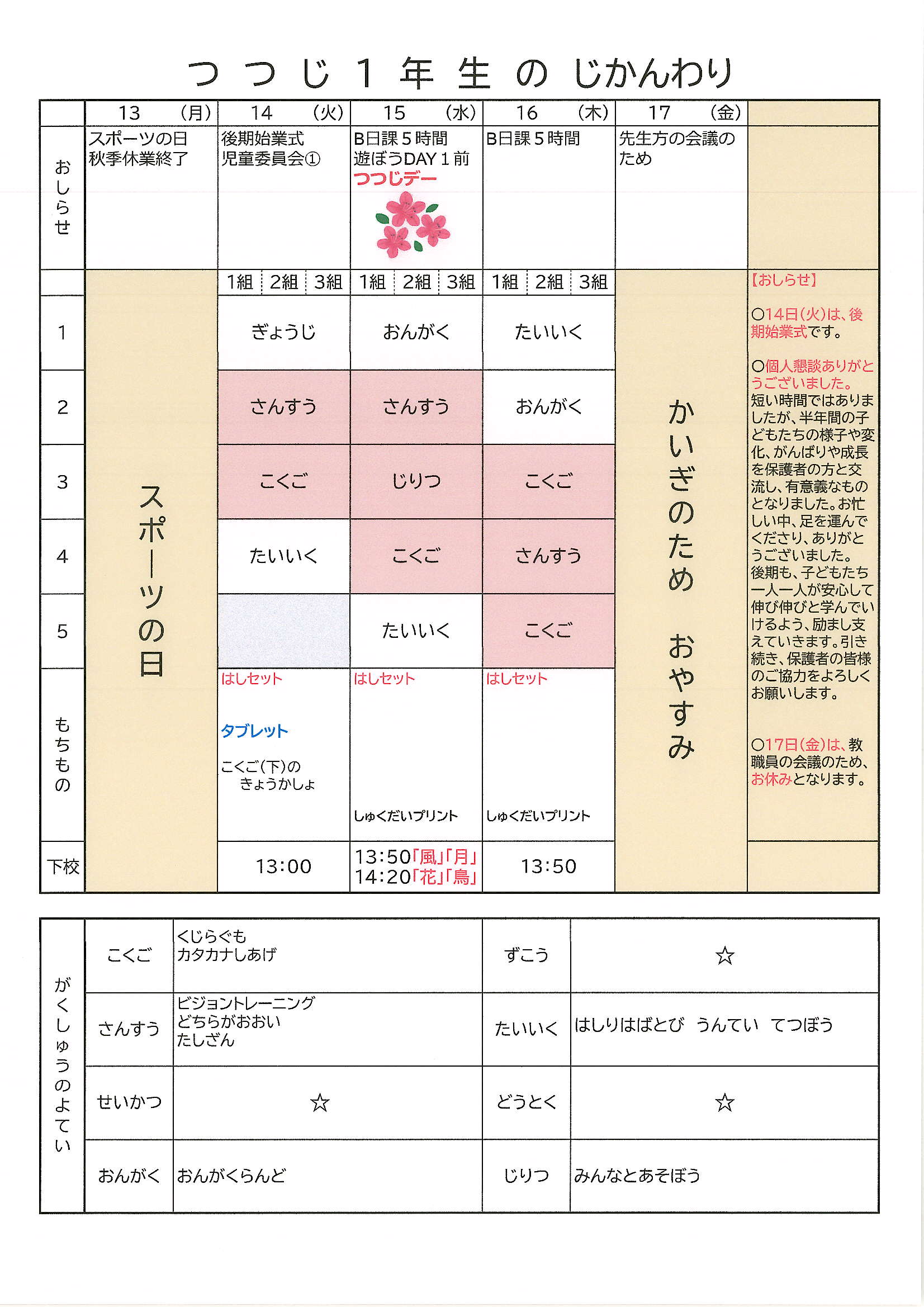 1年・時間割(3週目) 投稿日時 : 2025/04/18 編集長 カテゴリ: 一部表示されていない部分がありましたので、新しいものを掲載し直しました。 1年0421~.pdf 1年つつじ0421~.pdf