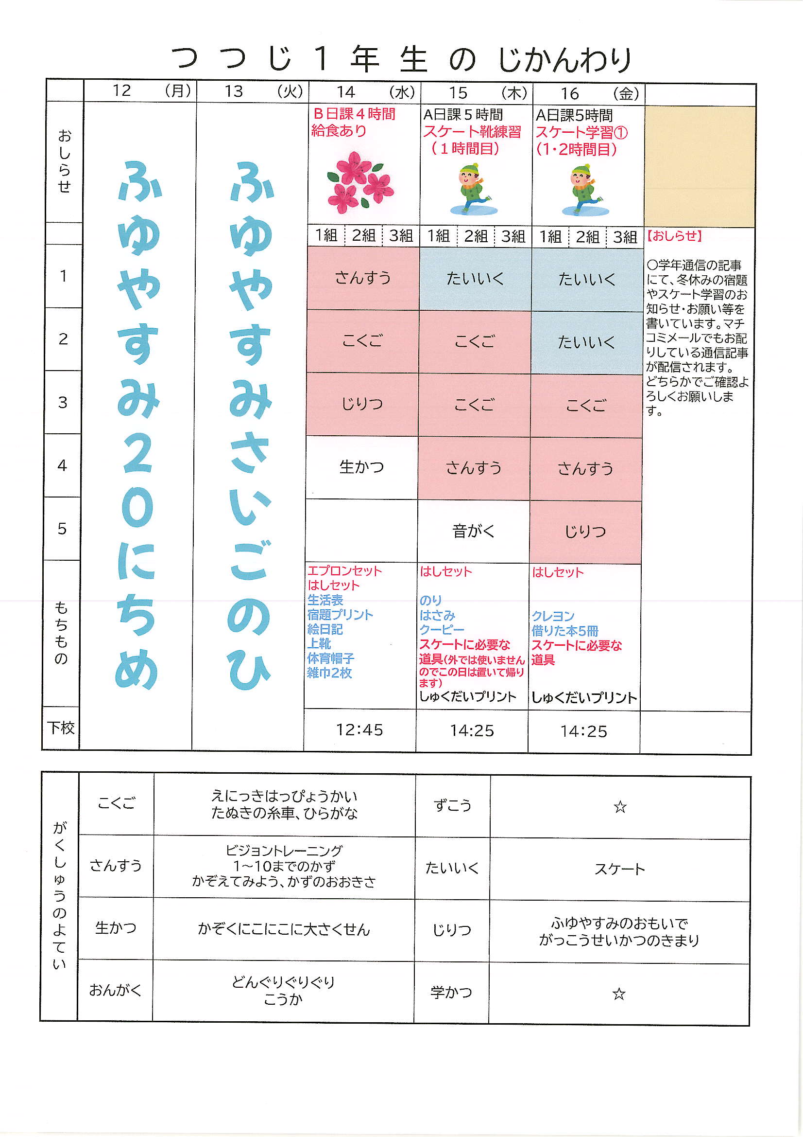 2025年 1年生のページです 全ての記事 全ての記事 カテゴリ アーカイブ 2026年1月 (2) 2025年12月 (4) 2025年11月 (4) 2025年10月 (5) 2025年9月 (4) 2025年8月 (1) 2025年7月 (4) 2025年6月 (4) 2025年5月 (5) 2025年4月 (4) 10件 1件 5件 10件 20件 50件 100件 時間割(37週目) 投稿日時 : 01/23 編集長 カテゴリ: 1年0126~.jpg 1年つつじ0126~.jpg 時間割(36週目) 投稿日時 : 01/16 編集長 カテゴリ: 1年0119~.jpg 1年つつじ0119~.jpg 時間割(35週目) 投稿日時 : 2025/12/23 編集長 カテゴリ: 1年0112~.jpg 1年つつじ0112~.jpg 時間割(34週目) 投稿日時 : 2025/12/19 編集長 カテゴリ: 1年1222~.jpg 1年つつじ1222~.jpg 時間割(33週目) 投稿日時 : 2025/12/12 編集長 カテゴリ: 1年1215~.jpg 1年つつじ1215~.jpg 時間割(32週目) 投稿日時 : 2025/12/05 編集長 カテゴリ: 1年1208~.jpg 1年つつじ1208~.jpg 時間割(31週目) 投稿日時 : 2025/11/28 編集長 カテゴリ: 1年1201~.jpg 1年つつじ1201~.jpg 時間割(30週目) 投稿日時 : 2025/11/21 編集長 カテゴリ: 1年1124~.jpg 1年つつじ1124~.jpg 時間割(29週目) 投稿日時 : 2025/11/14 編集長 カテゴリ: 1年1117~.jpg 1年つつじ1117~.jpg 時間割(28週目) 投稿日時 : 2025/11/07 編集長 カテゴリ: 1年1110~.jpg 1年つつじ1110~.jpg 1234 »