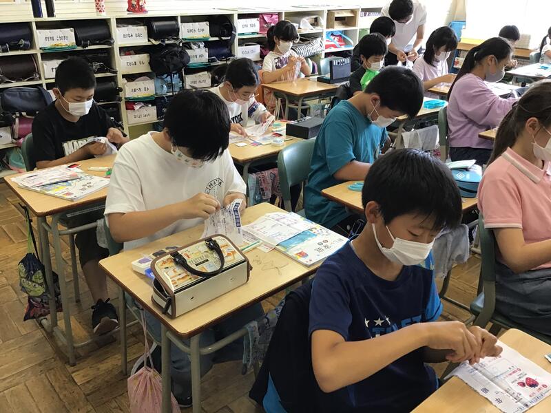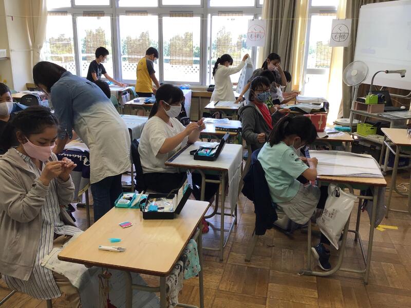 今日は5年生が家庭科の学習で、玉結びと玉止めの練習をしていました。
