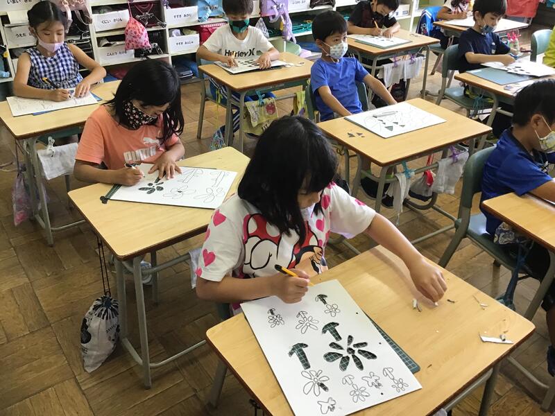 2年生の図工では、カッターを使って紙を切り抜く作業を行っていました。