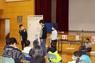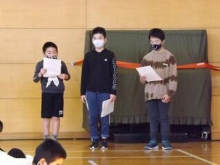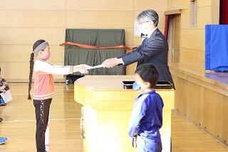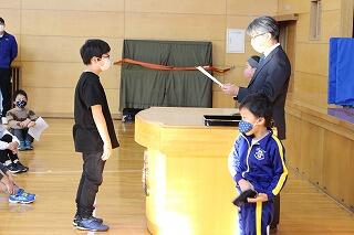 認証式につづき、市内創意工夫展の賞状授与が行われました。本校からは4名の児童が出品し、奨励賞をいただきました(この日はそのうちの1名が欠席しました)。