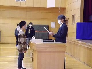 本日、朝のパレットタイムで全校集会が行われ、後期児童会書記局の認証式を実施しました。
