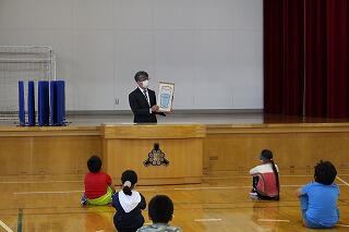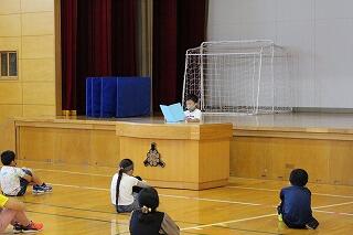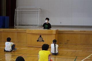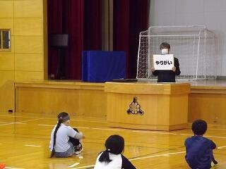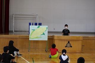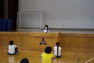 「親切コーン」という児童会の取組の結果を紹介しながら前期を振り返って、後期も引き続き頑張りましょう、というお話がありました。