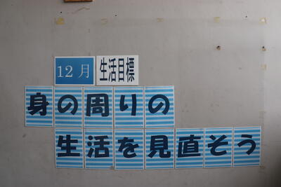 12月になりました。11月には雪が積もり、今年はどうなるだろうかと思いましたが、本日は気温もプラスですので、比較的暖かいと言えそうです。 そんな、12月の目標が階段躍場に貼られていました。新常任委員会体制で初の標語となります。