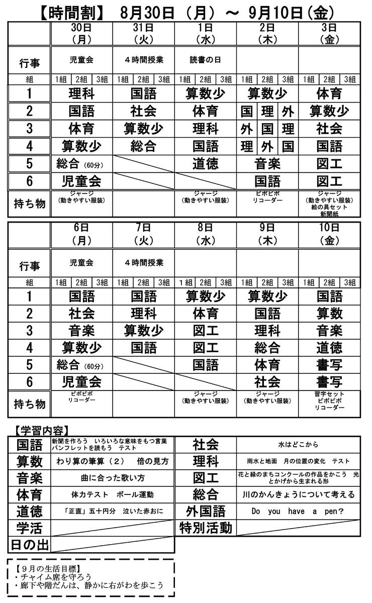 ホーム学校紹介 学校長挨拶教育目標グランドデザイン校章・校歌・沿革児童数・教職員数特色ある取組学力向上の取組いじめ防止基本方針生活の様子(ブログ)行事予定おたより各種マニュアル入学・転入出のご案内アクセスサイトポリシー学習動画保護者の方へ