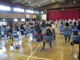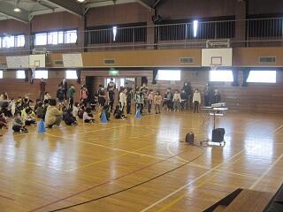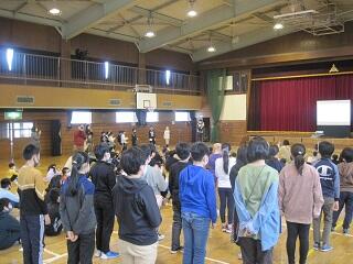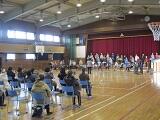 毎年、縦割り班による「ふれあい広場」で取り組んでいるいじめについての宣言のあとの全校集会。
