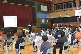 そこで、20日5時間目に、会長さんをはじめとする千歳バーガー協会の方々と卵を生産しているイセ食品から講師をお招きし、体育館で学千歳バーガーについての学習をしました。