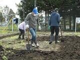 おやじの会、PTA役員とコミュニティスクールの協力を得ながら全ての畑を起こし、肥料をまぜました。