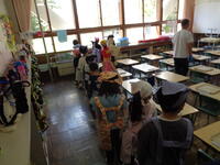 連休明け、今日から1年生は給食を自分たちで盛り付けたり、配ったりします。