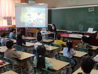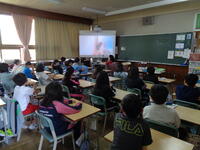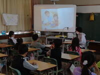 写真は1年生の様子です。多くの方が絵本を電子黒板に映して行っています。