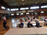 写真は千歳中学校の体育の先生が6年生にマット運動を指導している場面です。