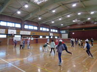 写真左は4年生体育の様子。ボール運動(ミニバレー)を行っています。