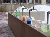 玄関前には1年生が絵の具で色をつけた氷を飾っています。とてもきれいです。