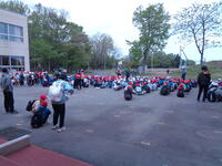 写真は出発式に向け、全校が玄関前に集まっているところです。