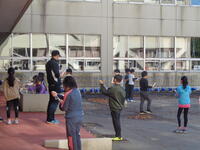 5時間目、4年生は玄関前で空気てっぽうの実験をおこなっていました。