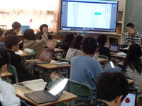 一人一人の考えをタブレットに打ち込み、全員で共有しながら「ここがいいね。」と評価しあっていました。