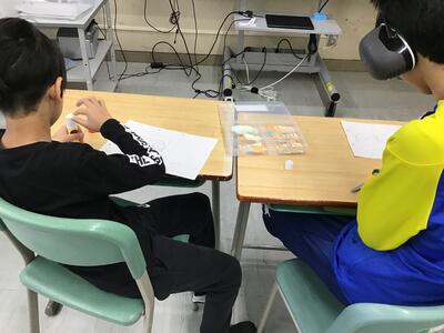 小学生と中学生がペアになり、中学生が少し小学生を手助けしながら作業を進めます。
