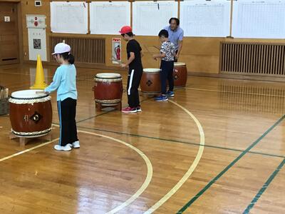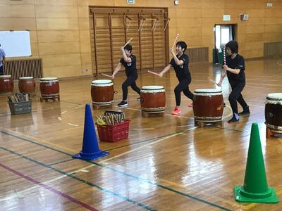小学校、中学校ともに体育館にて太鼓の授業を行いました。