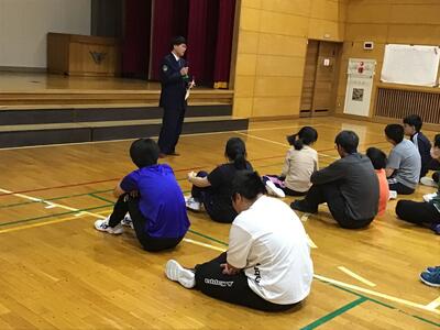 その後、校外等で不審者に出会ってしまったときの対応「いかのおすし」を全校で確認し、中学生向けのインターネットマナーに関するお話も、千歳警察署の生活安全課の方にしていただきました。