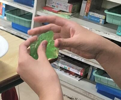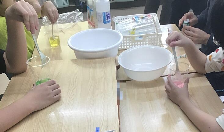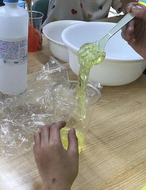 自分の好きな色のスライムを一生懸命に作り、できたスライムを引き伸ばしたり、手のひらの上で丸めてみたり…。思いつくままに自由に形を変えて変化を観察したり、触感を楽しんだりしました。化学の不思議を体験しました。