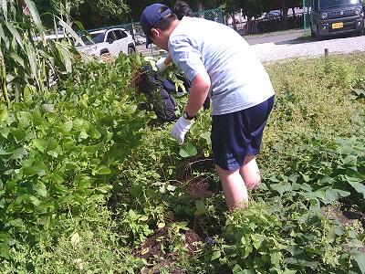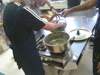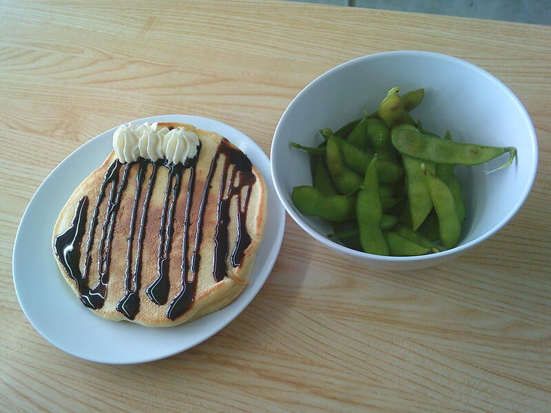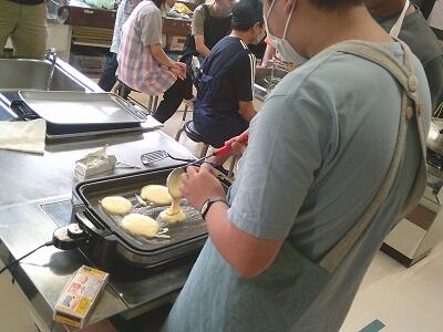 パンケーキと枝豆。枝豆は、収穫から始めました。収穫したての枝豆は味が濃く、とてもおいしかったです。パンケーキは、材料を買い出しに行き、お玉やフライ返しを使って上手に焼くことができました。仕上げにお好みのトッピングをして、みんなでおいしくいただきました。