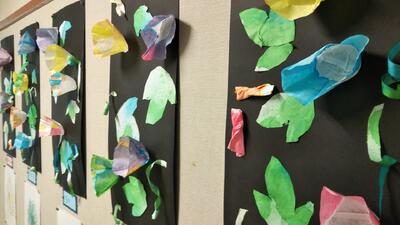 中学年の廊下に朝顔をモチーフにした制作物が掲示されています。