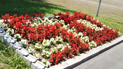 6月に3年生とPTAボランティアのお母さん方と植えた花壇。赤と白のベコニアの株が大きくなり、「50」がくっきりと目立つようになりました。