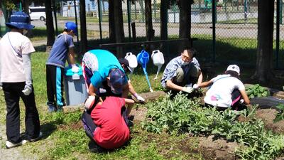 中学校では、菜園の雑草取り、収穫、表示の取り付けなどを行いました。