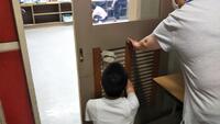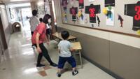 小学校低学年も教室から机を出す作業、介助員の助けを借りながら一生懸命運んでいました。