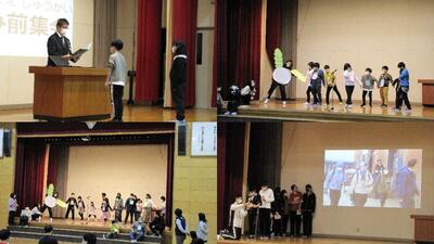 児童生徒会役員の運営のもと、冬休み前集会を実施しました。校歌のあとに校長からこれまでの子どもたちのがんばりを称えるとともに命の大切さについてお話をしました。その後、各種コンクールで受賞した子どもたちの賞状伝達や読書月間の表彰を行い、最後は小学校、中学校それぞれの発表がありました。小学生は国語でも学習した「おおきなかぶ」を二グループに分かれて演じ、中学生は修学旅行の様子を報告してくれました。ステージで表現することに慣れてきている様子がうかがえ、よい表情で発表していました。