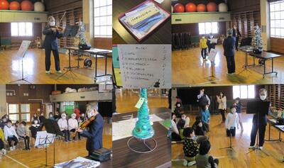 本日、学校運営協議会の会長さんが、小学生にバイオリンを演奏してくださいました。「カノン」「夢をかなえてドラえもん」「クリスマスメドレー」など全6曲の素晴らしい演奏に子どもたちも職員も聞き入りました。演奏前には、代表の児童が日頃のお礼にと、工作の時間に作ったクリスマスツリーとお手紙をプレゼントしました。