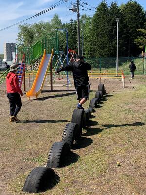 学校前の小公園の遊具で遊びました。