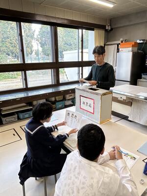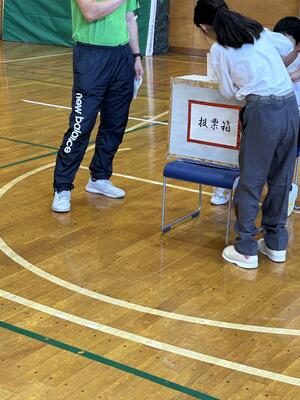 児童生徒会の会長、副会長、書記に立候補した3名の立会演説会と投票が行われました。