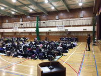 本日午後、体育館で新入生説明会が行われ、次年度入学する小学生と保護者が来校しました。生徒会役員による中学校生活の説明などが行われ、真剣な表情で聞き入っていました。児童向け説明会の後、6年生の児童たちは4つのグループに分かれて、体験授業を受講しました。