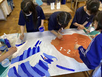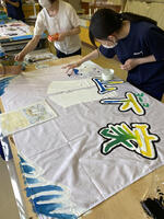 A4サイズの原案の何倍もある1枚の布に、下書きをし、ポスターカラーで色を塗っていきます。