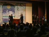 集会の前には、英語暗唱大会3位になった生徒とバドミントン部の生徒の表彰が行われました。