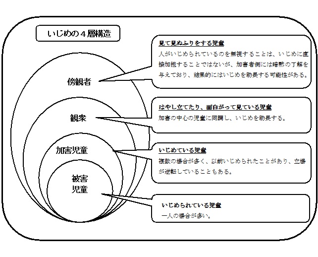 ・いじめの加害・被害という二者関係だけでなく、学級等の所属集団の構造上の問題を理解して対応するとともに、「観衆」としていじめをはやし立てたり面白がったりする存在や、いじめを見て見ぬふりをして周辺で暗黙の了解を与えている「傍観者」の存在にも注意を払い、集団全体にいじめを許さない雰囲気が形成されるようにすることが必要である。