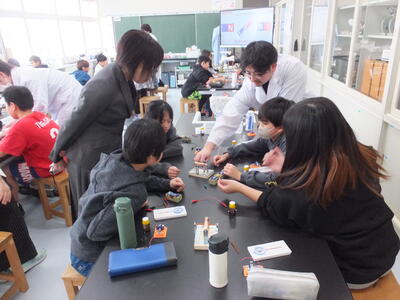 同日、3.4時間目 理科室で5年生対象のデンソーサイエンススクールを実施しました。電磁石の性質を知ったり、モーターを使って発電したりしながらリニアモーターの動くしくみを学びました。たくさんの実験をとおして、実験からしくみを理解し、原理を覚えることができました。貴重な経験となる時間を過ごすことができました。