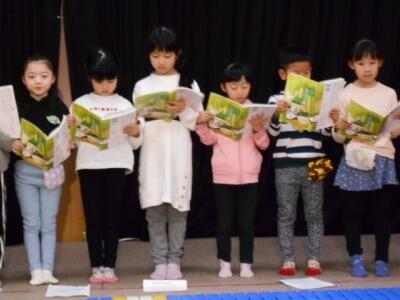 まずは国語の音読発表を聞いていただき、子どもたちは少し緊張しながらも、はっきりとした声で読み上げることができました。