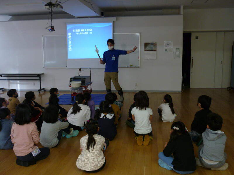向陽台小学校を卒業したという先輩が、さけについてわかりやすく教えてくれました。2年生の集中して「聴いて」いる様子に注目です。