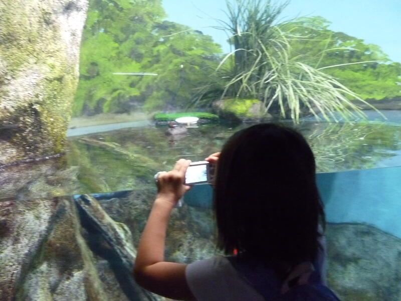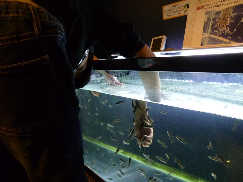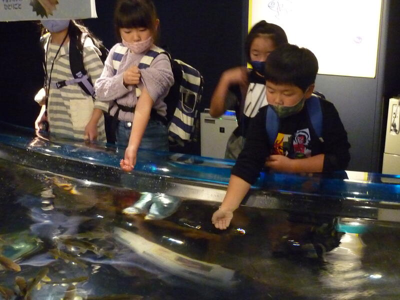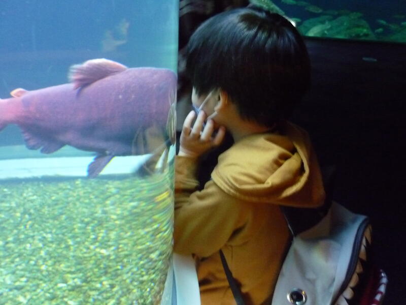 興味深くジーっと見入っています。将来、魚博士になるかも!?