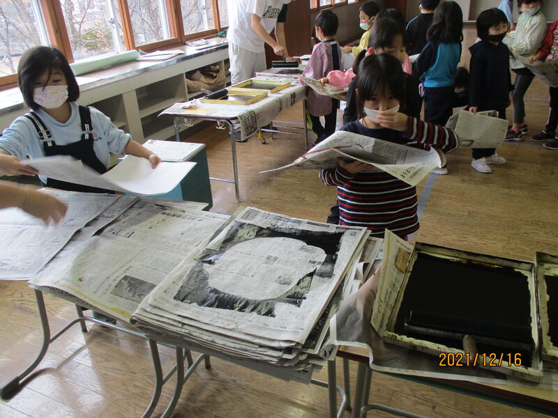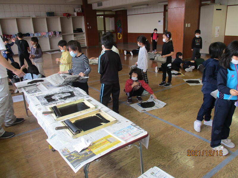 1年生は「自分の顔と手」、2年生は「学習発表会を発表している自分」というテーマで紙版画を作り、この日に一緒に印刷をしました。