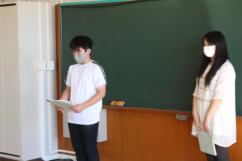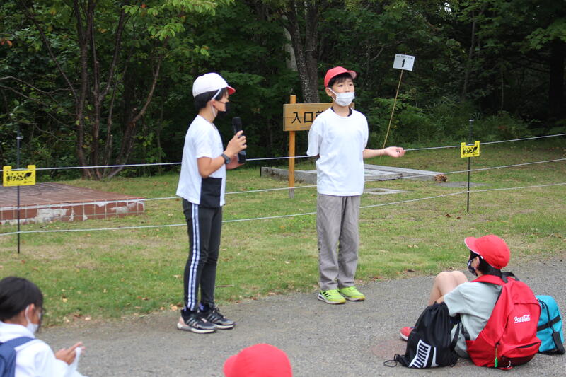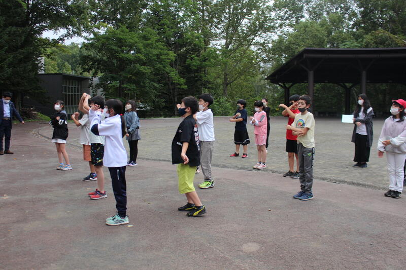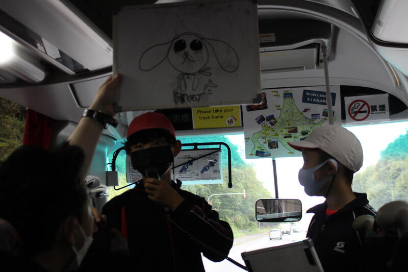 【出発後、恵庭市にさしかかったくらいからバスレクパート1が始まりました。バスレクをする意味の一つは、乗り物酔い防止です。今回の宿泊学習で、誰一人としてバスで具合が悪くなる人が出ませんでした。ねらいは、達成されたのです。6人のバスレク実行委員、ありがとう!!きっと不安や心配が大きかったことでしょう。よく乗り越えましたね。】
