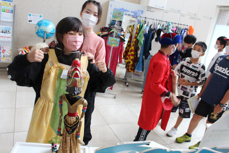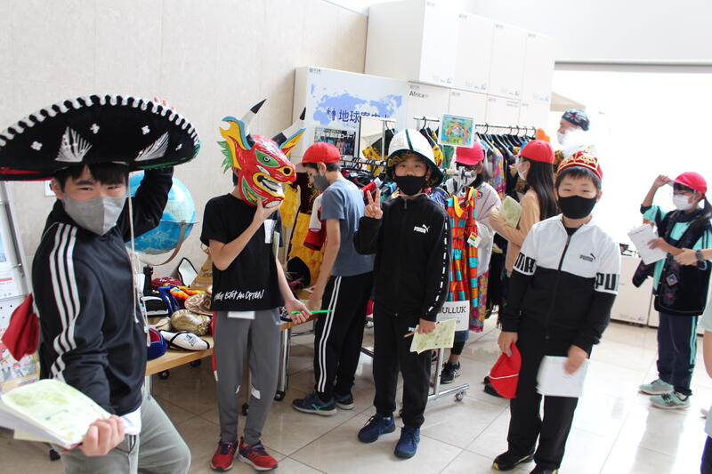【JICAでは、“実際に手で触れてみるコーナー”を敢えて設けているようで、諸外国の衣装なぞも自由に着られます。5年生は、おしゃれさんが多いようで、とっかえひっかえいろいろな衣装を着て、我が姿を鏡に映しポーズを決めていました。民族風に踊っている子もいました。】