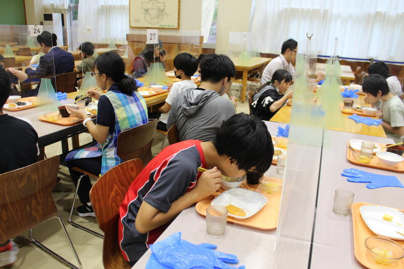 【部屋の掃除を念入りに済ませて、食堂で朝食です。コロナ感染症対策が手厚かったです。子供たちも、毎日の給食時間の“黙食”の習慣が、ここで活かされました。いっぱい食べて、最終日を楽しむぞー】