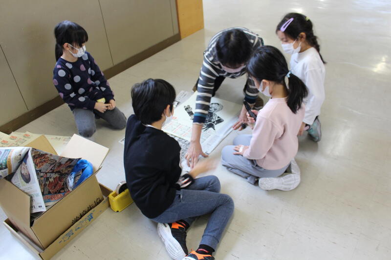 【4年生が、木版画に向けて彫刻刀の使い方を練習していました。】