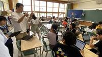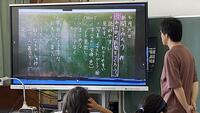 担任の先生は前回の復習として、スマホで撮影した画面を使って前回の授業内容を共有しました。子どもたちはその内容を振り返った後、グループに分かれて記事の構想を話し合い始めました。
