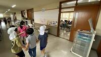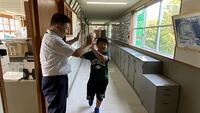 本校の自学ノート提出率が過去最高の92%を達成し、昼休みに校長先生との「両手でハイタッチイベント」が行われました。たくさんの児童が校長先生のもとに集まり、両手でのハイタッチを楽しみました。校長先生は一人ひとりに声をかけ、努力を讃えていただきました。図書室利用優待チケットが配付されました。優待内容が何種類か用意されていて、保健室で何が当たったかお互いに確認していました。