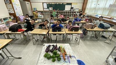 2年生が教材園から野菜を収穫しました。大根はうまく育ちませんでしたが、ナスやピーマンなど大きく育ちました。自然の恵みを体感しました。