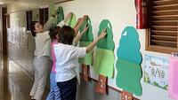 図書室前に素敵な掲示物を作っていただいたのは、PTAの「森ック」さんです。掲示物を作る際には、「学年が上がるにつれて高くなるように貼ろうか?」と相談しながら、丁寧に作業を進めてくださいました。